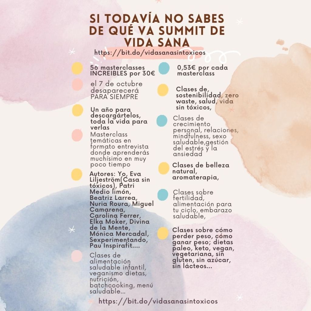 | NO TE EQUIVOQUES: NO ES OTRO BUNDLE El SUMMIT DE VIDA SANA llega con un formato totalmente distinto al que, probablemente, ya conocías. Ahora no necesitas registrarte en ninguna plataforma, web, o rellenar formularios de descarga. Son masterclasses en formato entrevista de entre 30 y 50 minutos, que vas a poder ver o escuchar en cualquier lugar en el que te encuentres. FA-CI-LÍ-SI-MO. En este Summit, además, participo como autora de la masterclass “Vida sin tóxicos” (la mía es de las larguitas 🤪) en la que además, te muestro tres recetas #superfavoritísimas para tener tu casa «como los chorros del oro», y sin sustancias que comprometen tu salud o la de tu familia. ¡¡lee hasta el final, porque hay regalos!! |